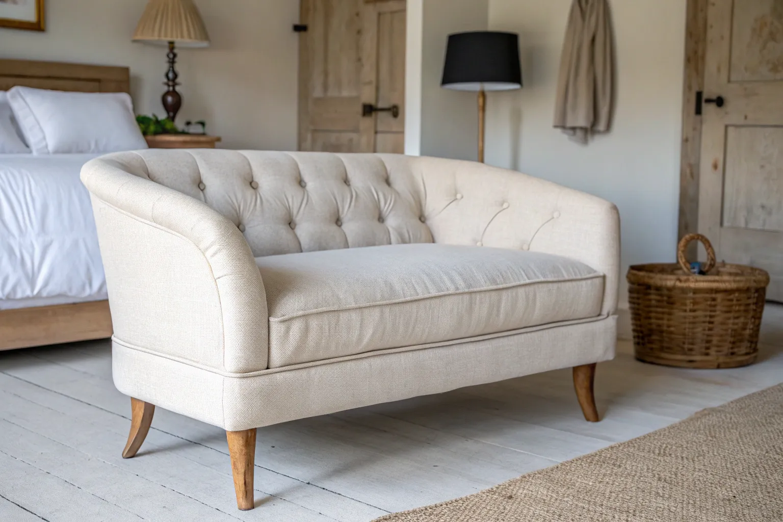 A loveseat with exposed legs keeps the end-of-bed area feeling airy, especially if your bedroom isn’t huge. I once added simple tapered wood legs to a thrifted loveseat, and it instantly looked lighter and less bulky.