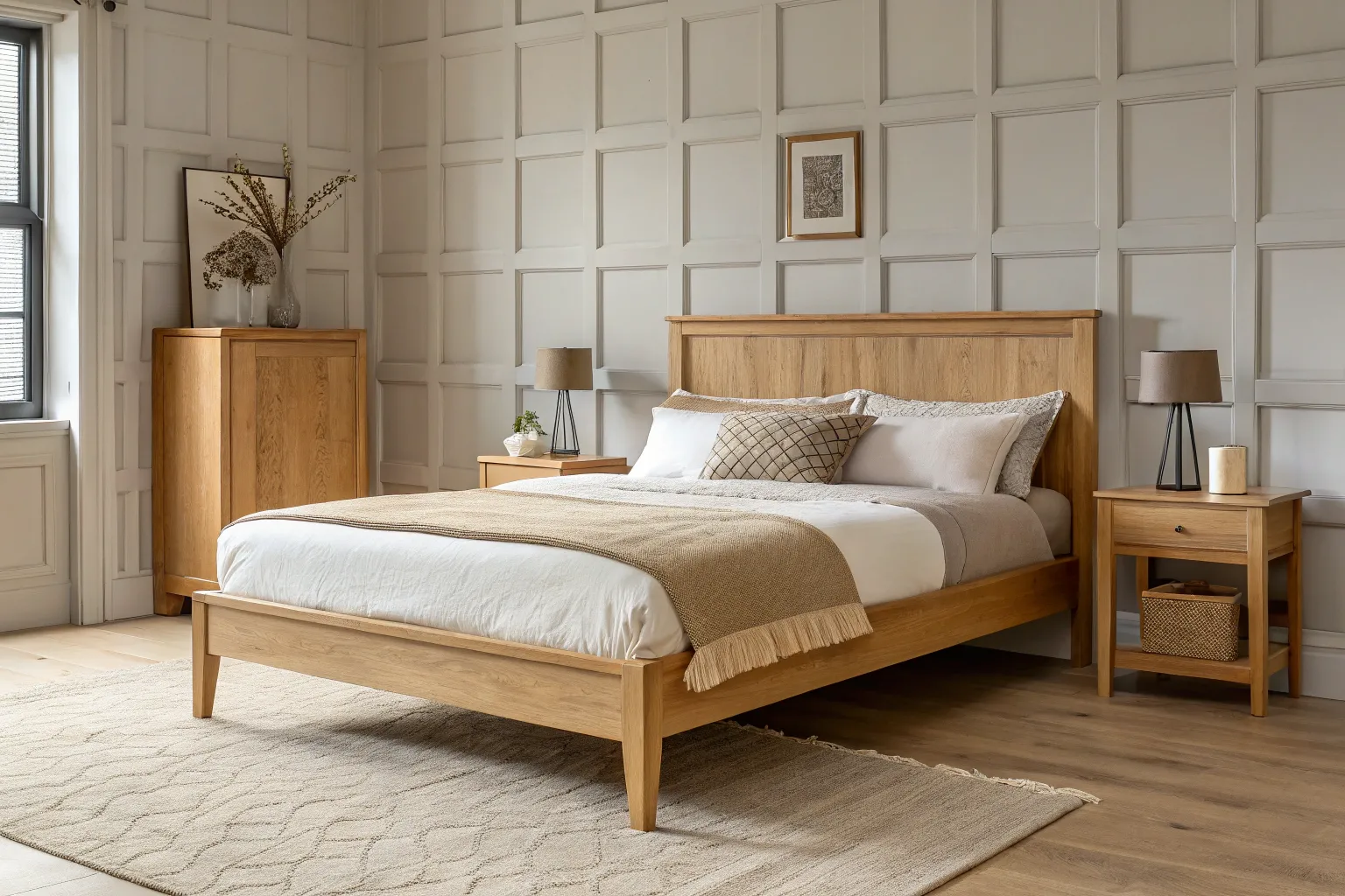 • Solid Wood Platform Bed Frame: Anchor your symmetrical design with a minimalist wood platform bed that complements the traditional wall texture beautifully.