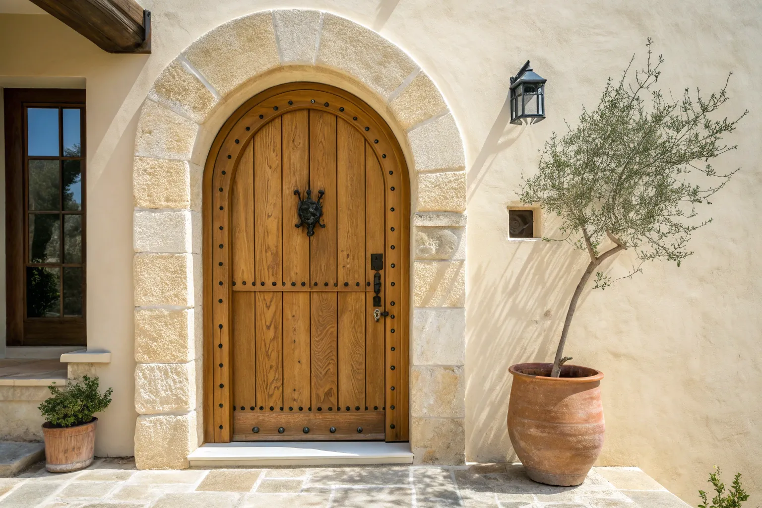 Arched solid-wood double doors for an instant Mediterranean villa feel—simple, warm, timeless.