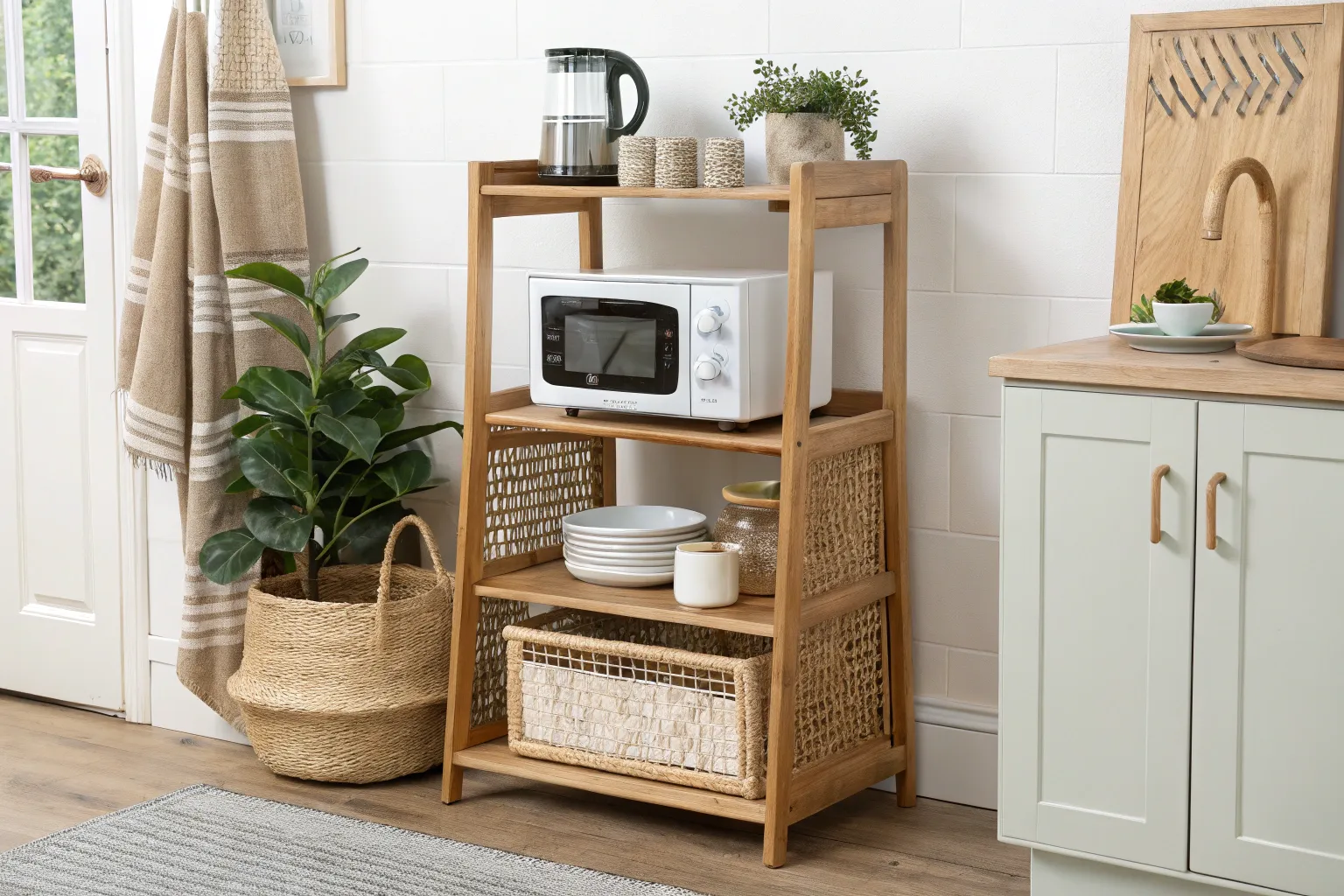 • Woven Storage Baskets: Organize loose items on your stand’s lower shelves while adding a warm, natural texture to your kitchen.
