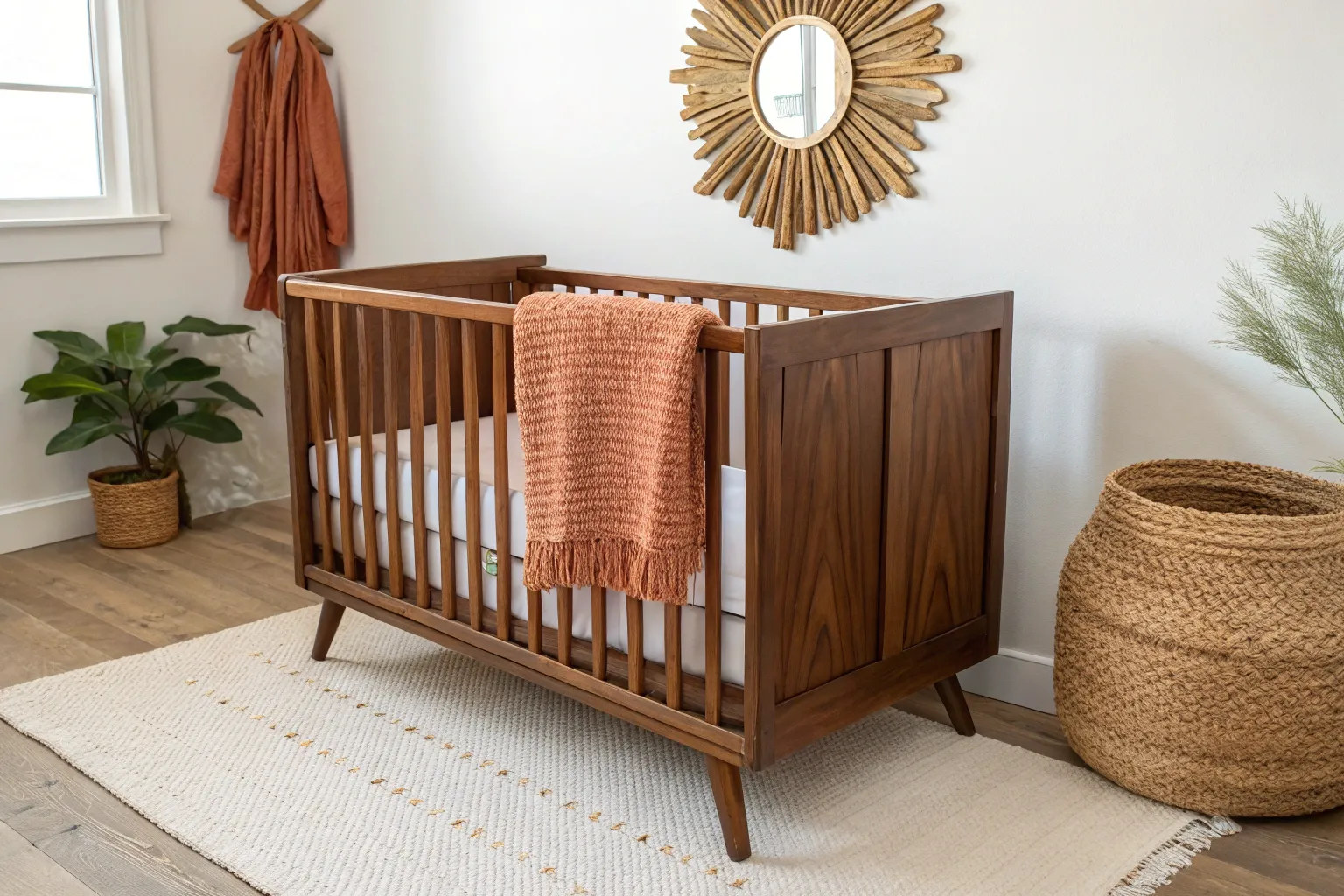 • Mid-Century Modern Convertible Crib: Anchor your nursery with clean lines and warm tones to create a timeless, cohesive foundation.