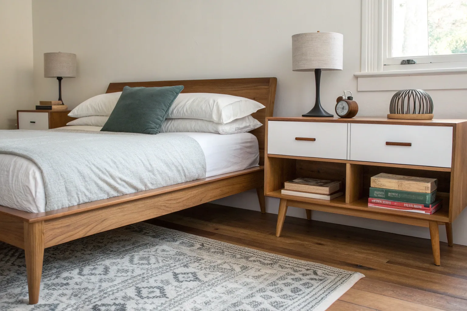 - Mid-Century Modern Nightstand (Walnut): Anchor one side of your bed with this rich, darker tone to create contrast and warmth immediately.