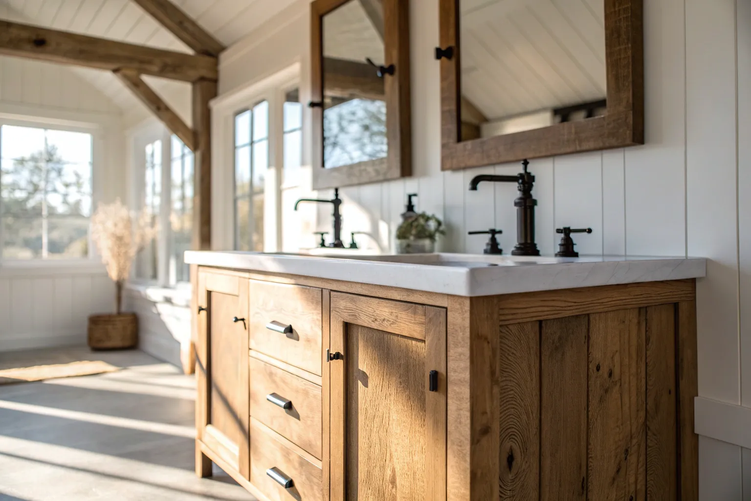 I like building chunky wood-framed mirrors because they bring that farmhouse warmth without adding clutter to a modern farmhouse master bathroom. Even a simple frame in a medium stain gives you that “finished” look I’m always chasing.