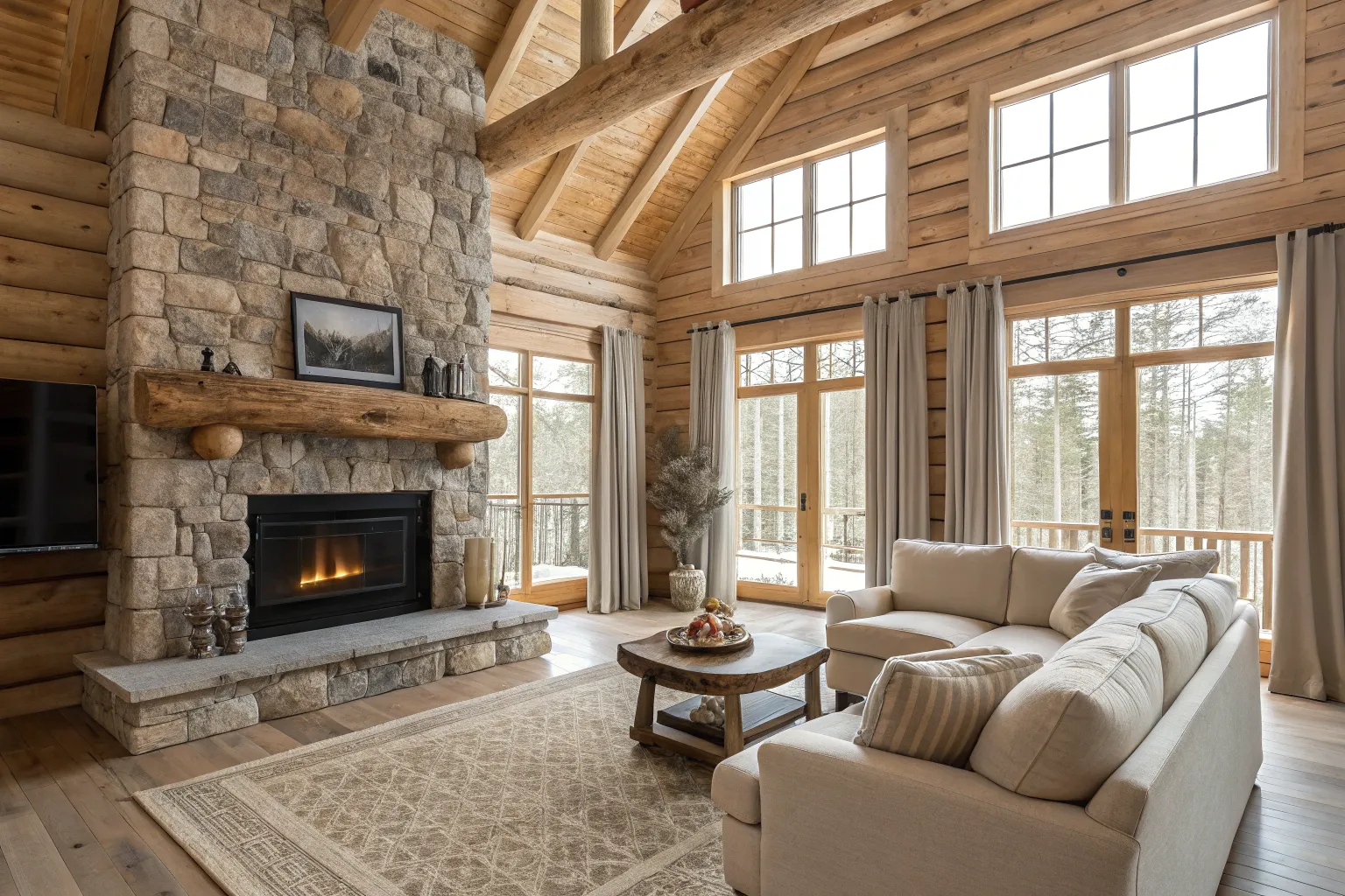 In every modern log cabin I’ve styled, linen curtains are my cheat code for keeping those big views while softening the room. I hang them high and wide so the natural light still floods in, and it makes the logs look sunnier instead of yellow.