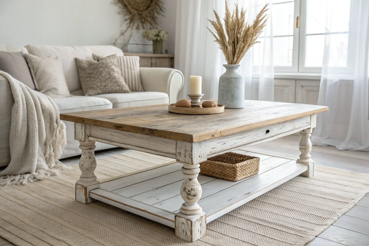 Nothing says modern shabby chic living room like a chunky distressed wood coffee table with a cleaner silhouette. I’ve built a few from reclaimed wood, and the little dings and grain swirls are what make the whole room feel warm.