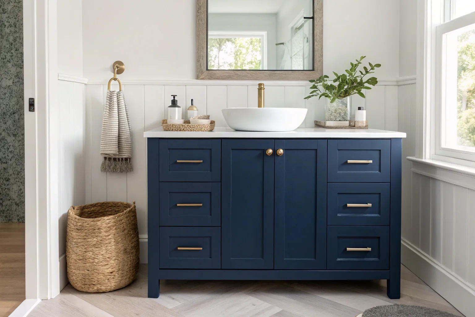 If you want charm, go for a freestanding navy vanity with legs so it feels like a piece of furniture. I’ve built a toe-kick-free base before, and that little shadow line makes the vanity look lighter in the room.
