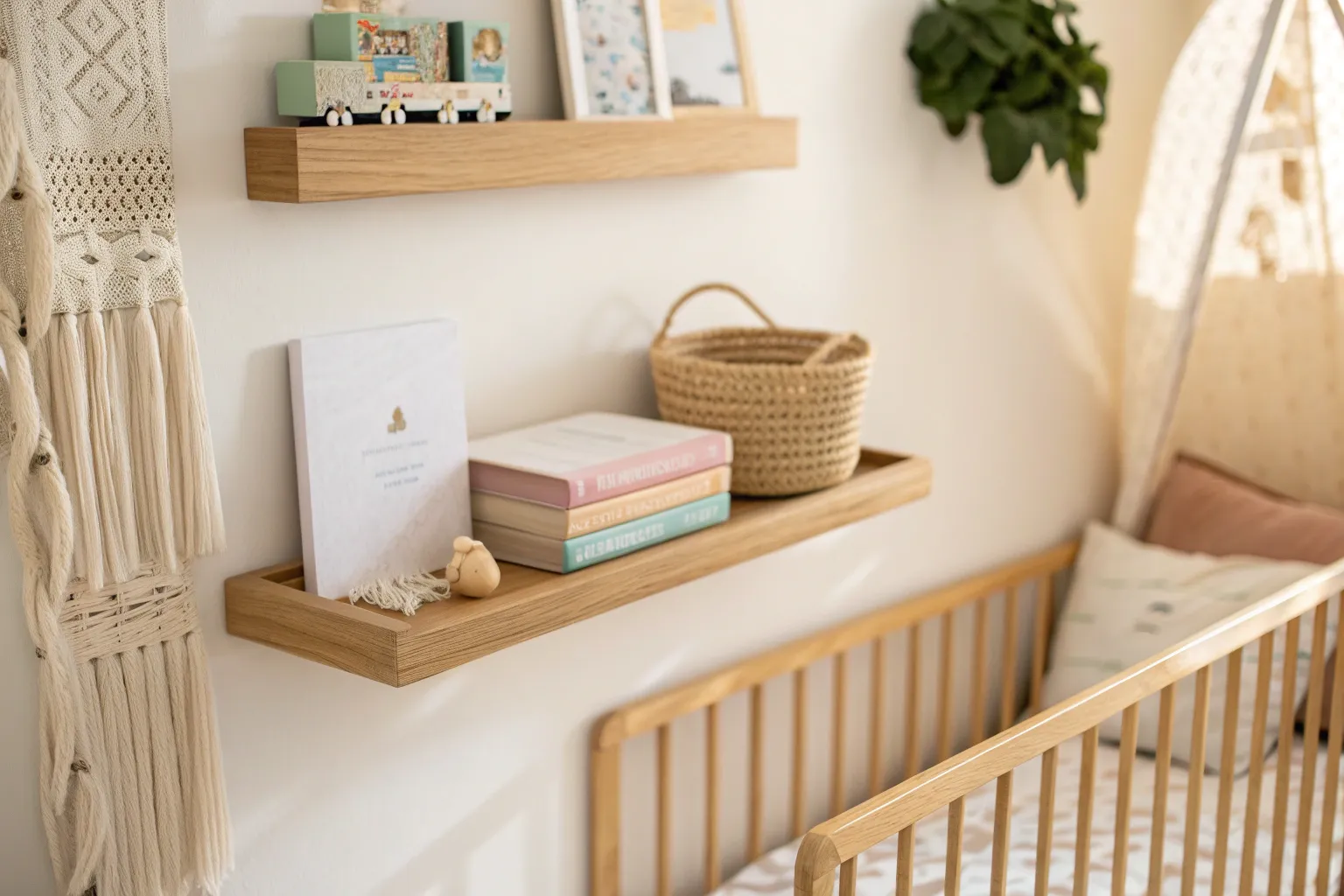 Stacking nursery shelves vertically fills that awkward wall slice and makes a cute little gallery without needing a big bookcase. I’ve styled mine with books on the bottom, a framed photo mid-level, and a soft toy up top for balance.