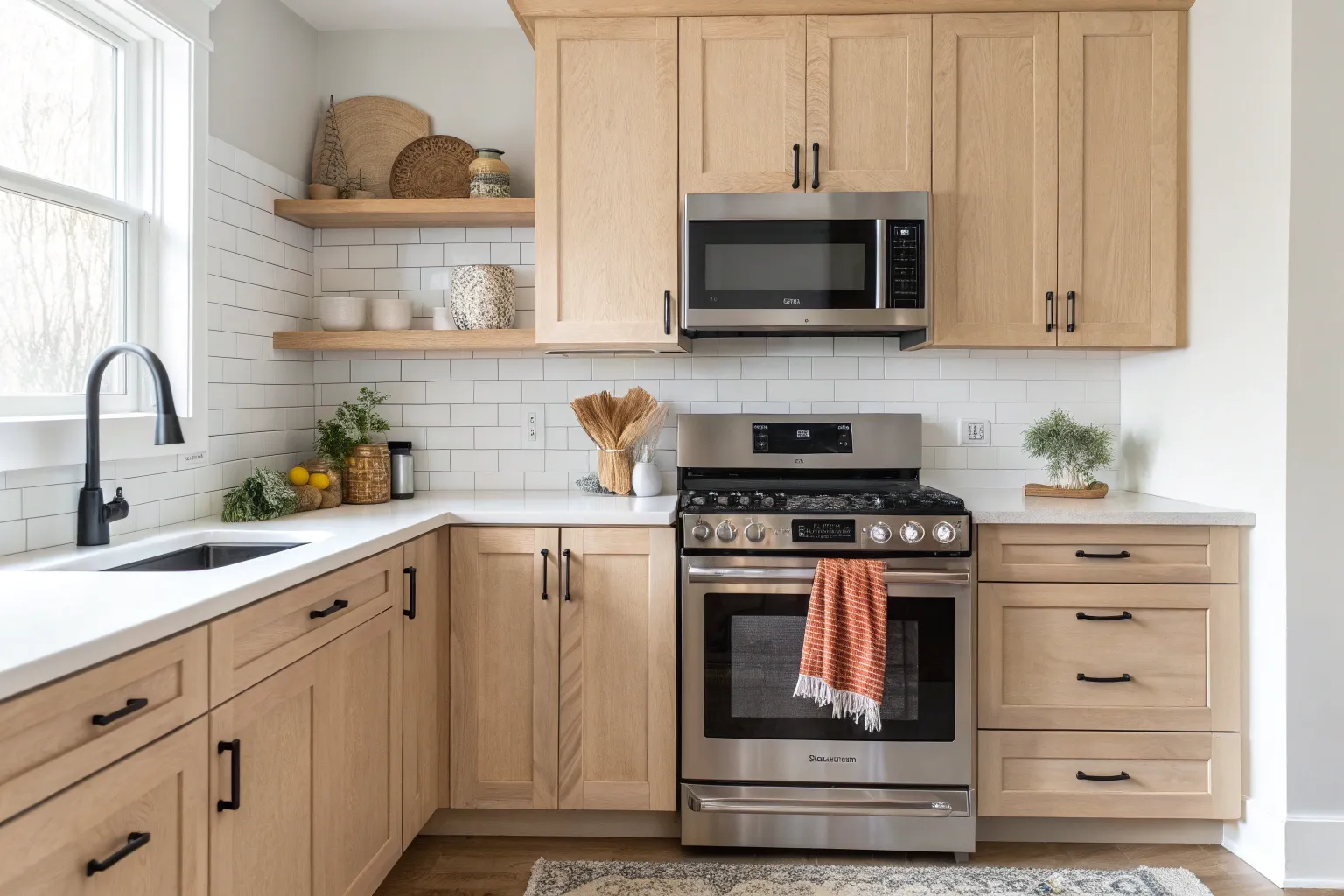 - Floating Wood Shelves: Instantly add warmth to your kitchen walls with sturdy floating shelves, perfect for displaying favorite dishes.