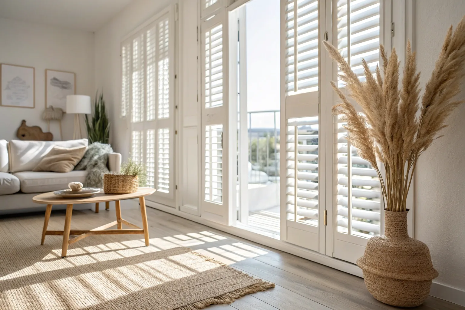 Some of the most dramatic plantation shutters images are full-height panels on patio doors, especially when they’re half-open to hint at the view beyond. I’ve staged this with a woven rug and a wood stool, and it instantly reads relaxed and high-end.