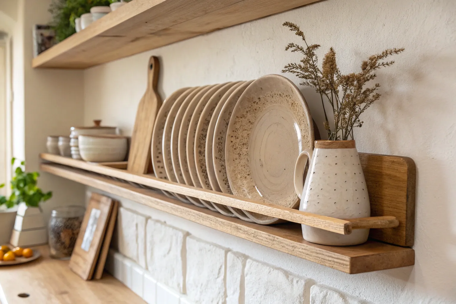 A good plate rail is one of my favorite ways to add instant charm and vertical storage without cluttering your counters. I love how a simple wood ledge lets you swap displays anytime—plates today, something totally different tomorrow.