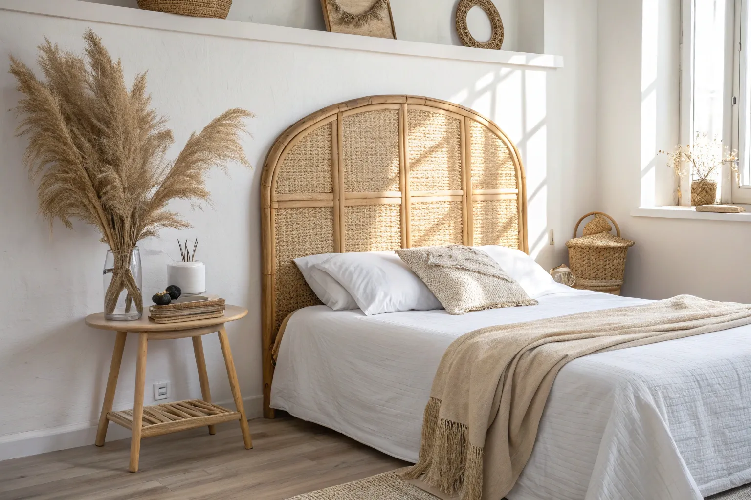 A woven rattan headboard that warms a plain wall—minimal, boho-soft, and beautifully crafted.
