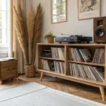 • Minimalist Wood Turntable Stand: Choose a compact stand with simple lines to recreate this look and maximize your listening space efficiently.