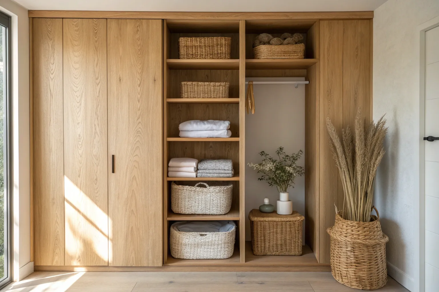 • Woven Storage Baskets: Place textured wicker baskets on shelves or floors to neatly organize loose items and add rustic warmth.