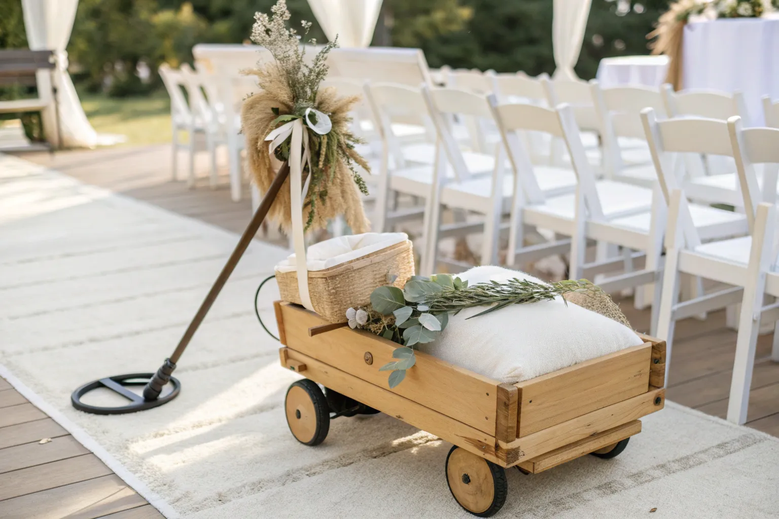 If your pup is part of the procession, I’ve seen a ring bearer wagon work beautifully by adding a low front gate and a short leash tie point inside. I always pad the floor and keep décor minimal so the dog doesn’t get tangled mid-aisle.