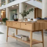 My most complimented entry setup was a round entryway table with a bold, geometric wood base—it felt like furniture and sculpture at once. I’ve built bases from stacked blocks and angled braces, and it’s the kind of piece that makes people stop mid-step.