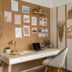 Turn the bulletin board into a monthly calendar by taping a grid and framing it with stained wood trim. I’ve used this setup in my own studio, and it keeps my projects visible without turning the wall into chaos.