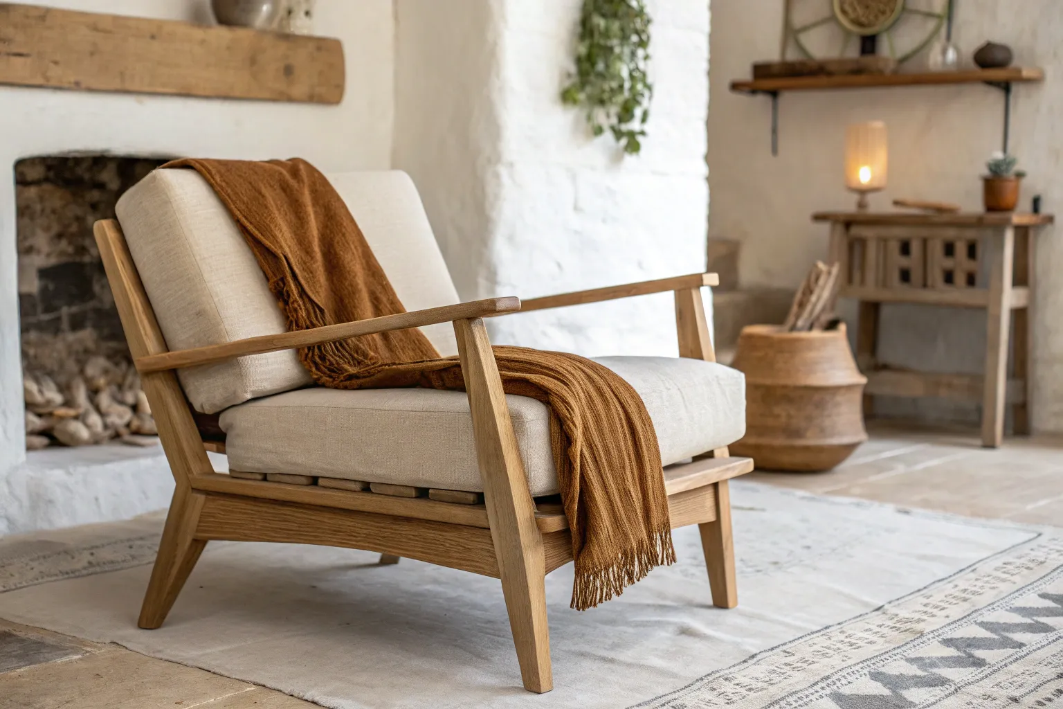 Layered neutrals meet warm wood: a sun-baked oak chair styled with cream and tan textiles.