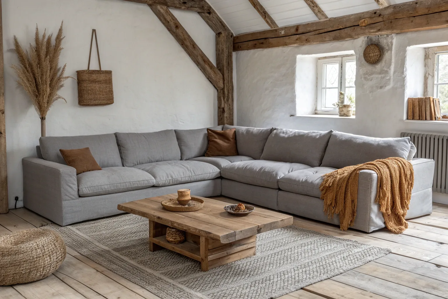 In my own living room setups, a grey sectional instantly settles the space, and a chunky reclaimed wood coffee table brings the brown warmth right back. I love leaving a few saw marks and knots visible so it reads truly rustic, not “perfect showroom.”