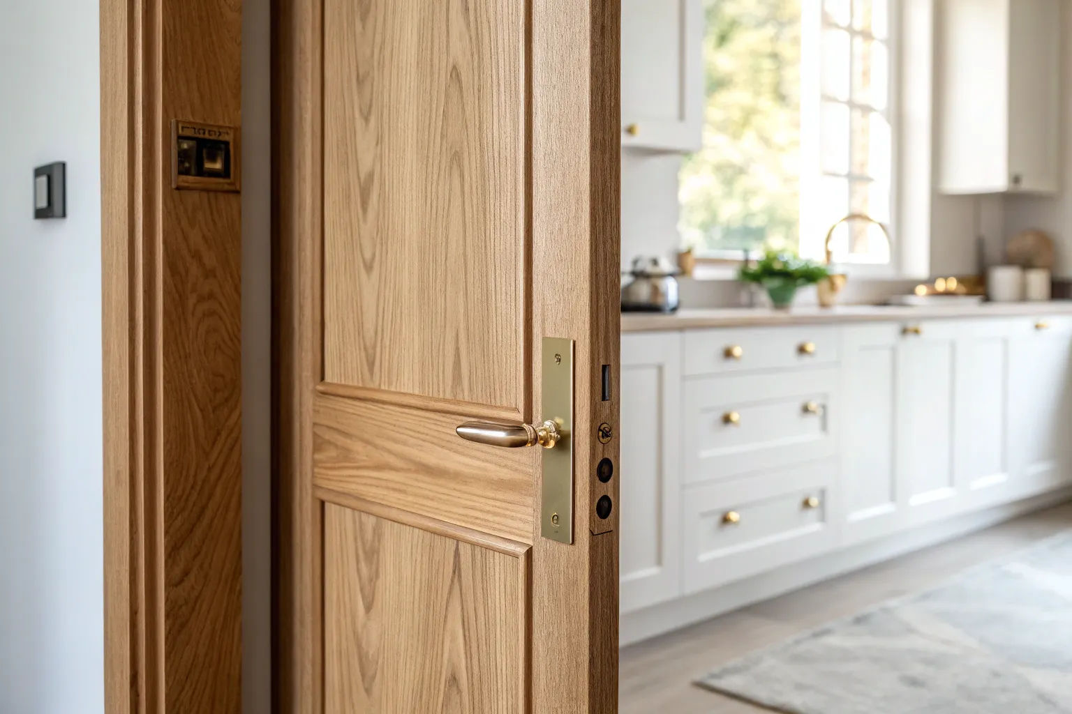 A hidden scullery galley behind oak doors—warm under-cabinet light and tidy shaker charm.