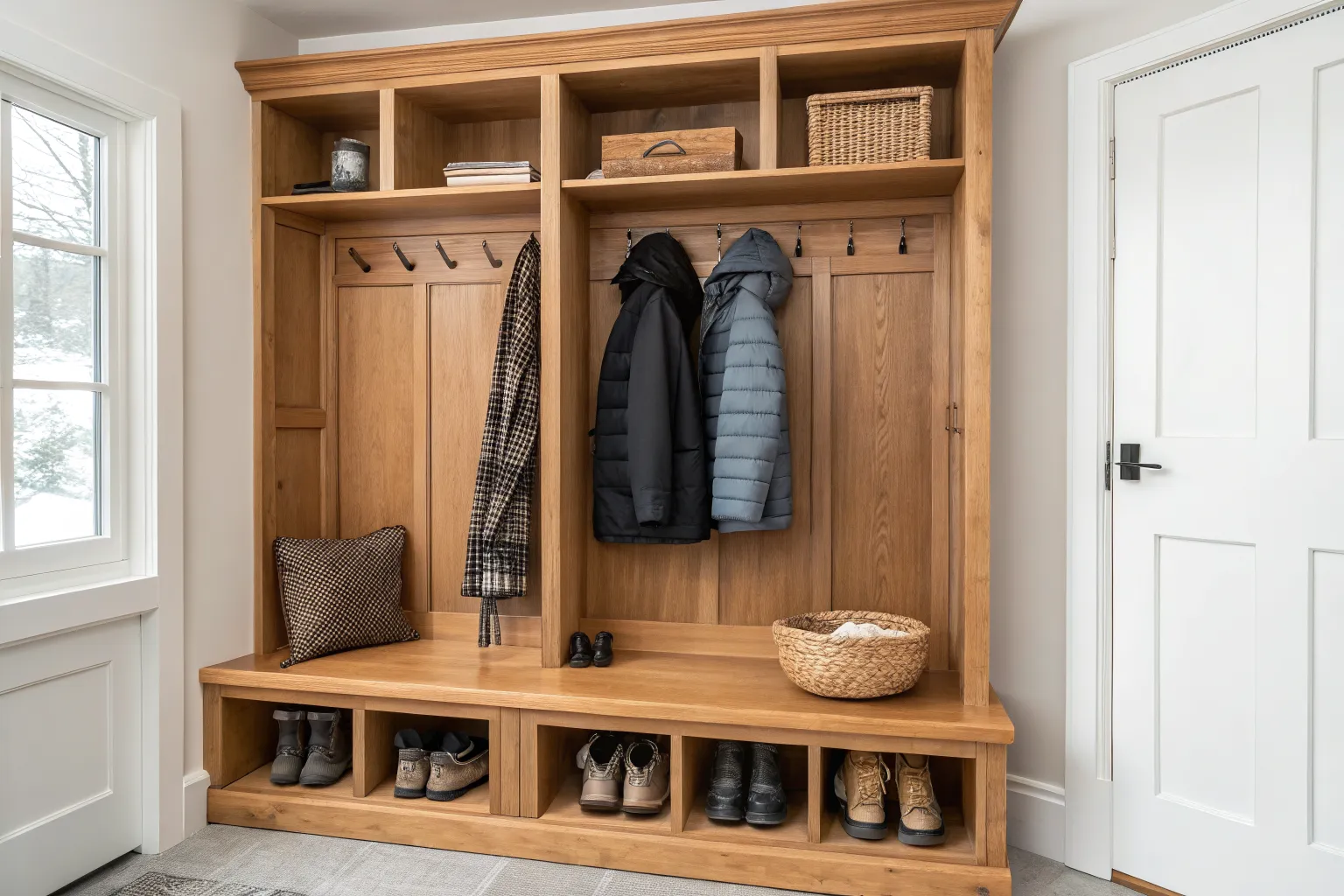 - Heavy-Duty Coat Hooks: Install durable double-prong hooks inside each cubby to securely hang heavy ski jackets and wet layers.