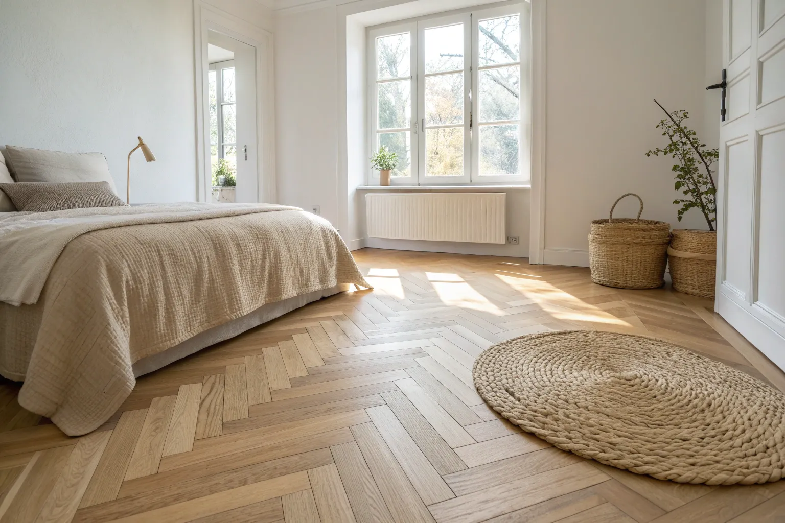 Herringbone flooring sounds fancy, but in a small bedroom it adds movement without adding clutter, especially in a light tone. I’ve installed a toned-down herringbone before, and it made the room feel wider while still staying calm and cozy.