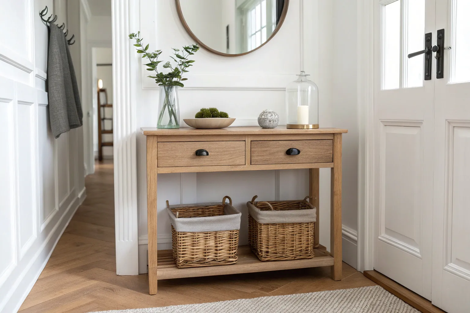 - Woven Seagrass Storage Basket: Add texture and practical floor-level storage for shoes or bags underneath your new entryway table.