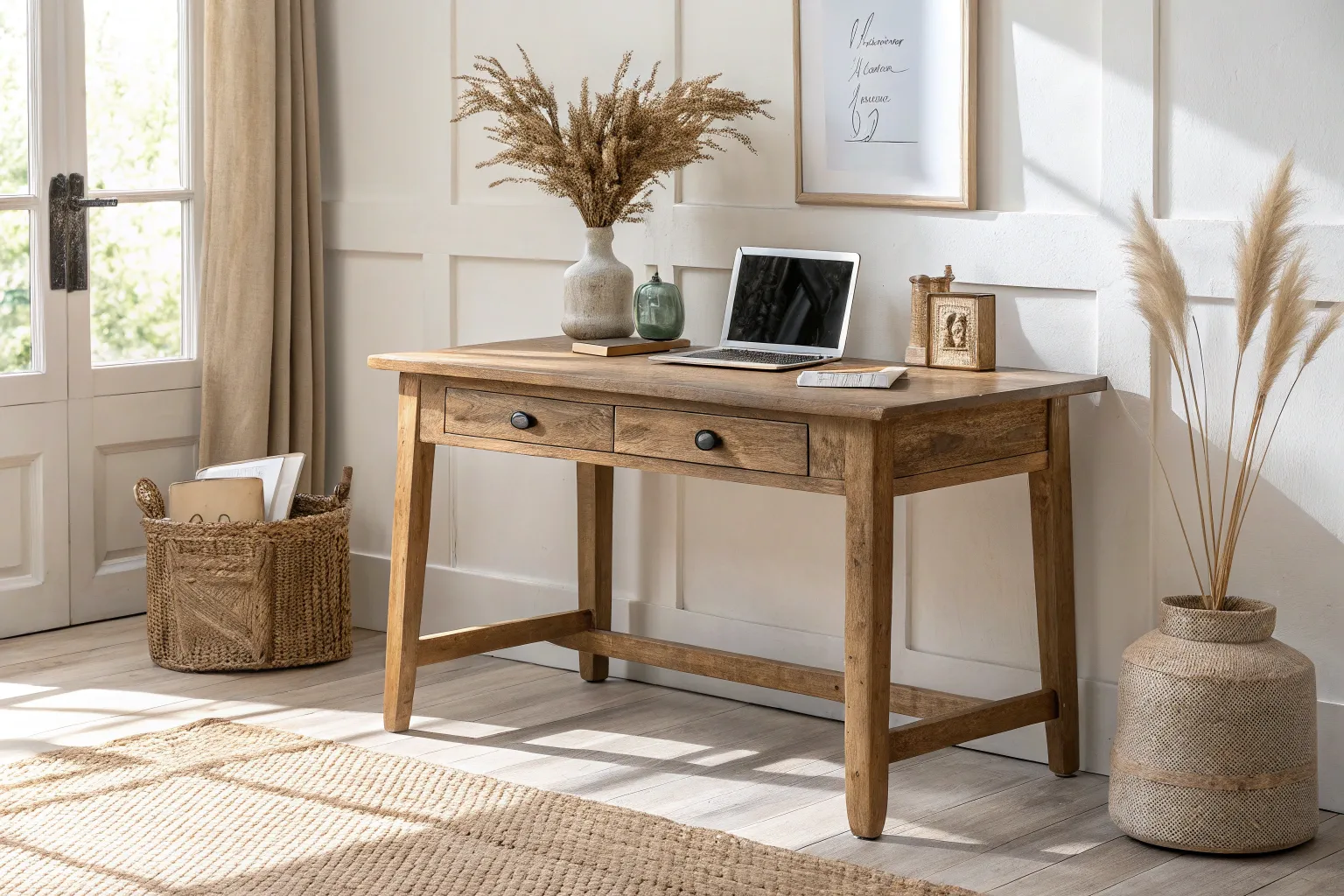• Farmhouse Writing Desk: Anchor your workspace with a rustic-style desk featuring natural wood tones to enhance that cozy, light-filled atmosphere.