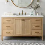 Smart approaches include wooden vanities (accepting they’ll age visibly, which many embrace as character), wood shelving paired with practical finishes, or wood accents like mirrors with wooden frames. Pale woods feel spa-like; darker woods create intimate, hotel-like luxury.