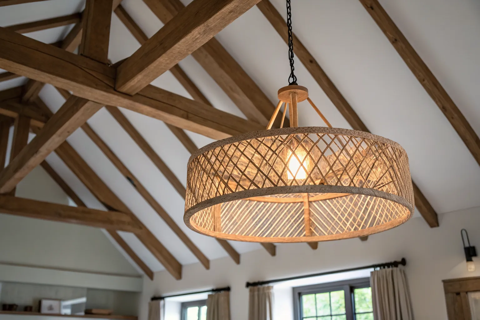 Suspending simple lantern-style pendants from king posts gives you that old-world timber frame vibe without going full lodge. I’ve used lantern forms in entry bays and they make the structure feel welcoming the second you step in.
