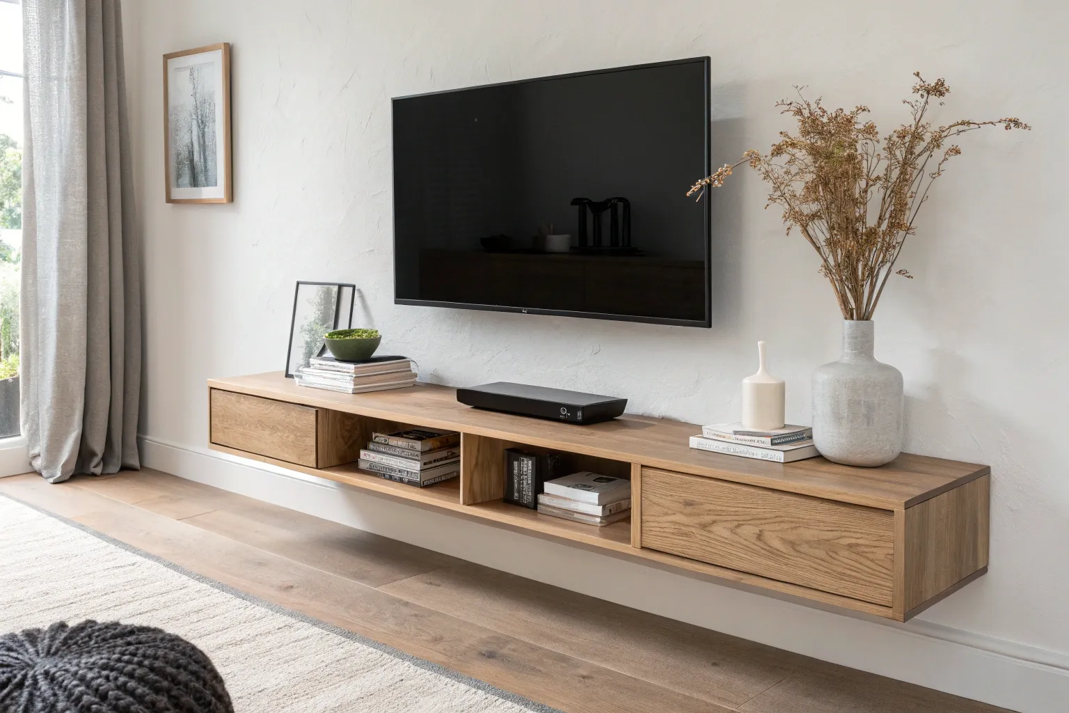 - Solid Wood Floating Shelf: Choose a thick, natural wood shelf to achieve that sturdy yet minimalist look beneath your wall-mounted screen.
