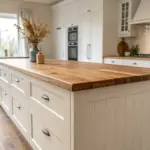 Mix butcher block on one tier with a stone countertop on the other to make the two levels feel intentional and not just “extra.” I love this combo because I can refinish the wood tier later, and it only gets prettier with use.