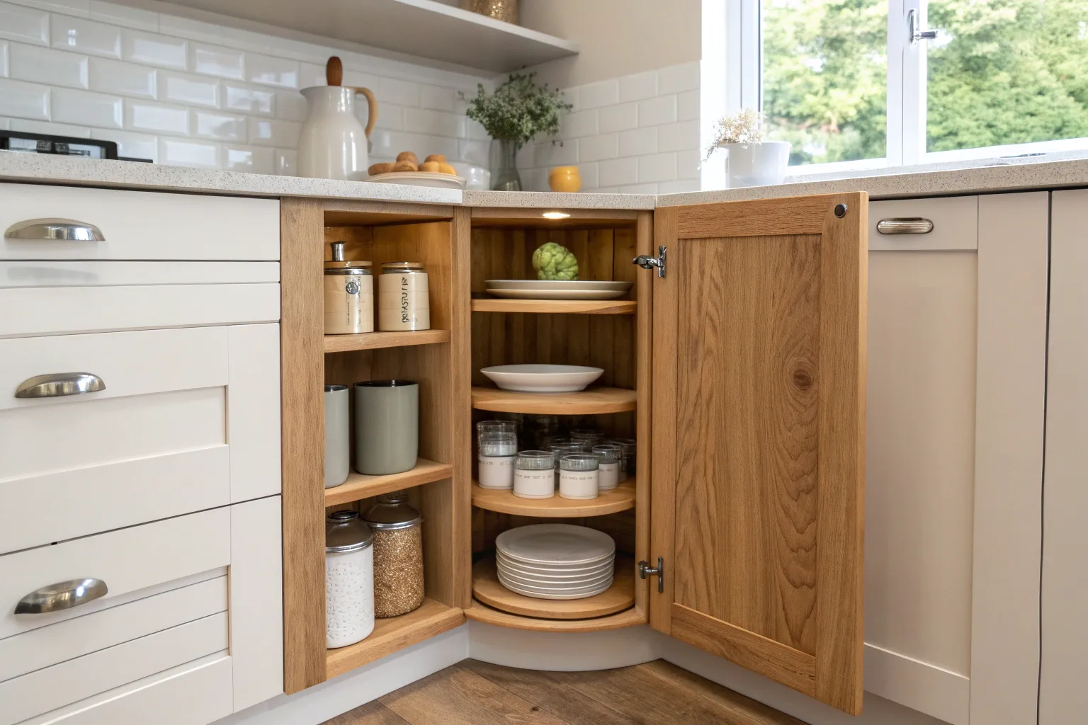 In my own upper corner kitchen cabinet, a simple lazy Susan is the fastest win because it brings oils, vinegars, and jars from the back to the front with one spin. I like using two smaller turntables instead of one giant one, because I can lift them out like trays when I’m reorganizing.