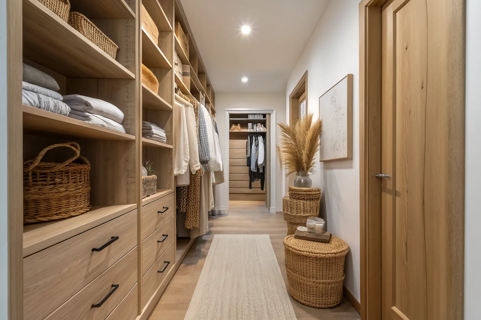 A long runner makes the walk-through closet read like a hallway on purpose, and it softens footsteps when you’re sneaking around early. In my own projects, I’ve used a low-pile runner to keep doors and drawers from catching, and it instantly warmed up the wood tones.
