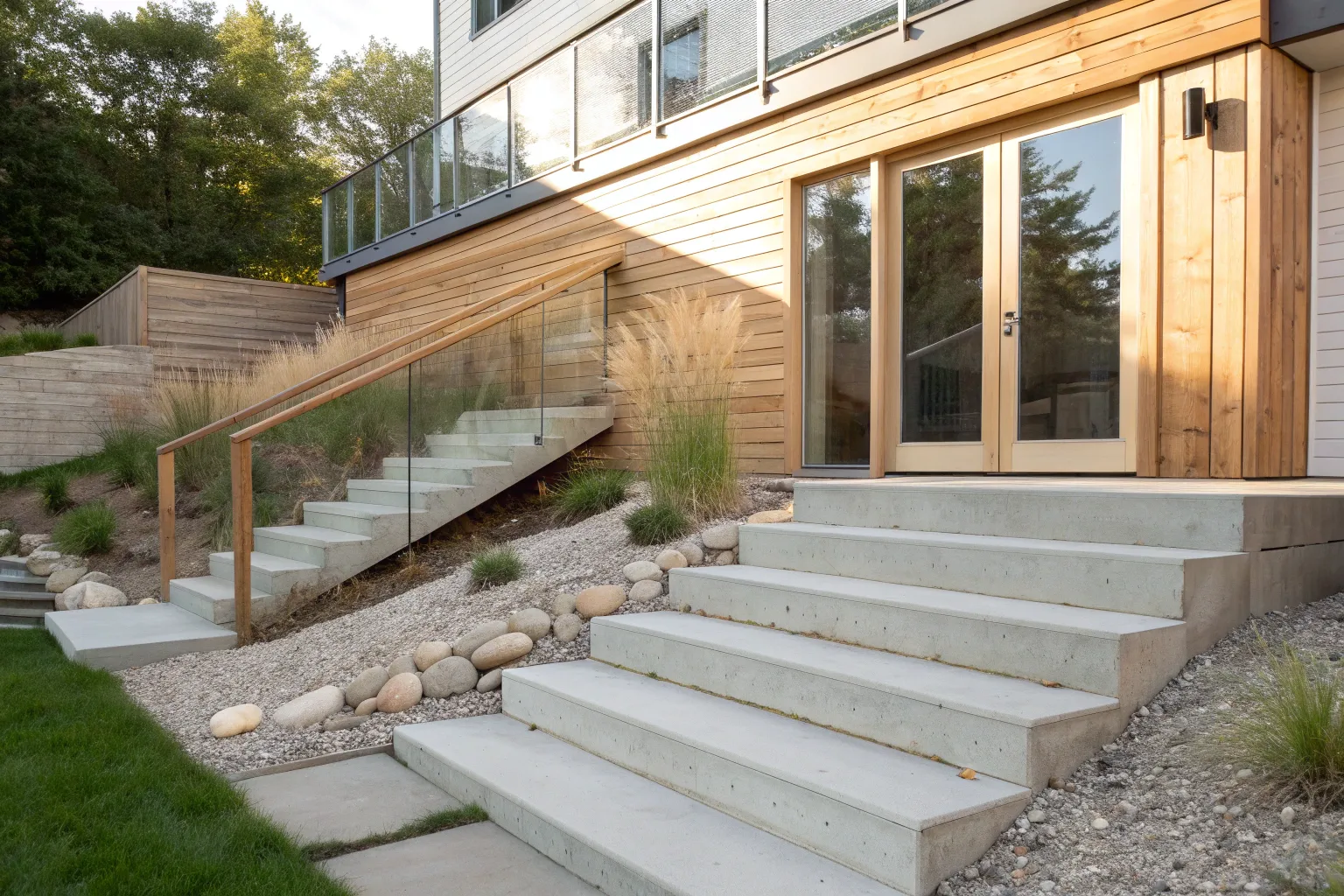 Timeless poured-concrete walkout stairs with crisp edges and a soft textured finish.