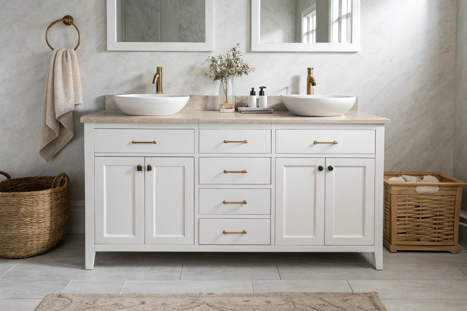 For busy mornings, I’m a huge fan of long white double vanity cabinets—I’ve built them with symmetrical drawer stacks so two people can claim their own zones. It’s one of those upgrades that feels “everyday practical” and still looks pretty.