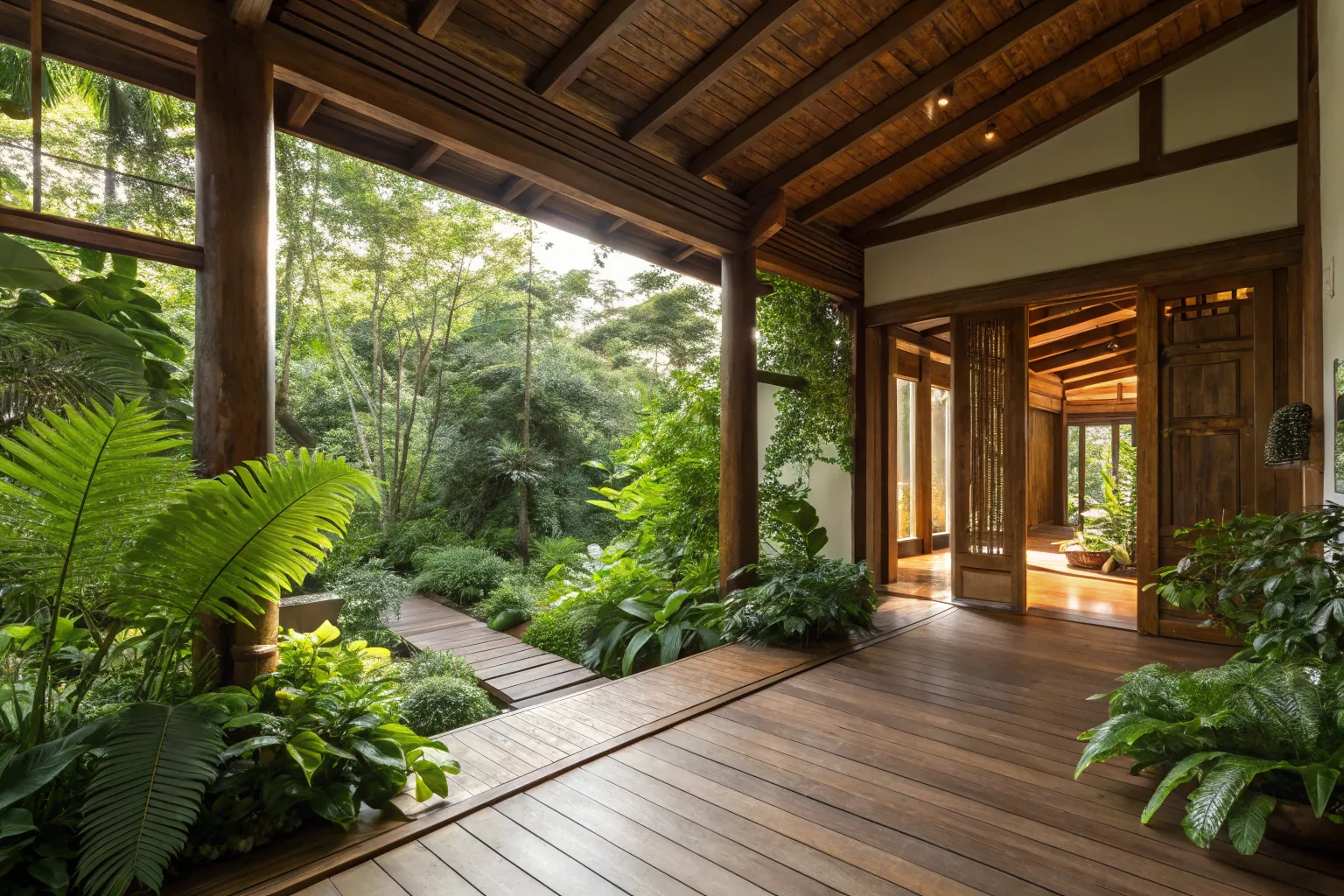 Plants behave like soft architecture. When used alongside timber, they form living columns, screens, and canopies that replace walls and ceilings with breathable boundaries.