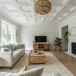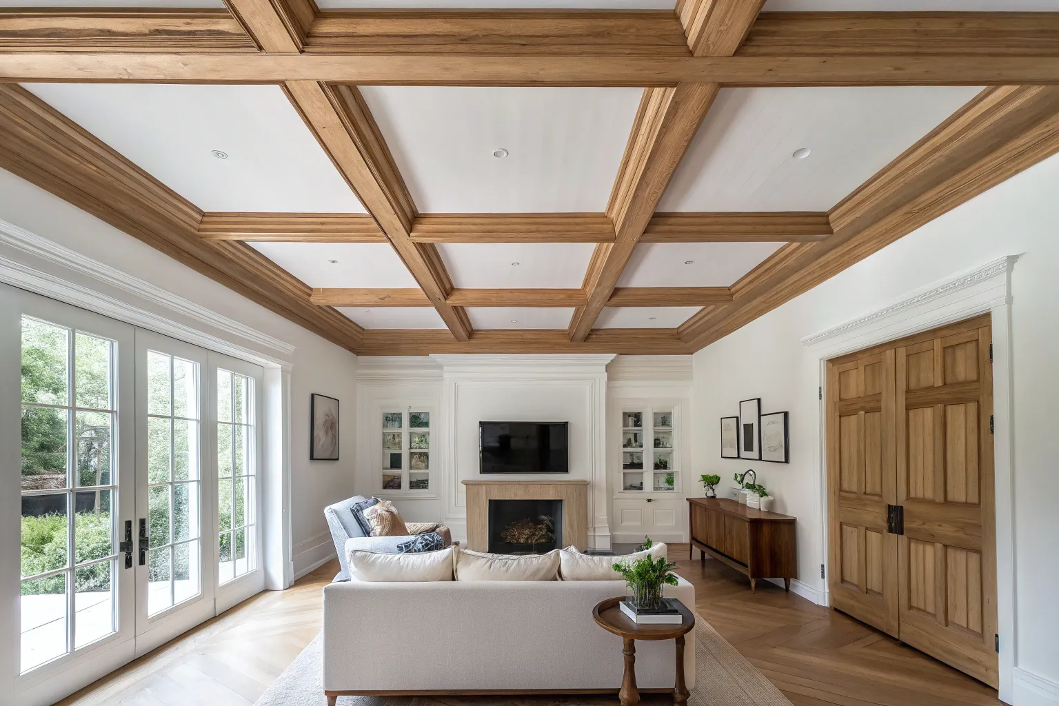 You can fake a coffered ceiling by laying out a grid of straight wood trim over a flat or plank ceiling, and it’s surprisingly doable with careful measuring. I’ve done it in dining spaces where the ceiling needed “architecture,” and the grid makes everything feel upscale and cozy.