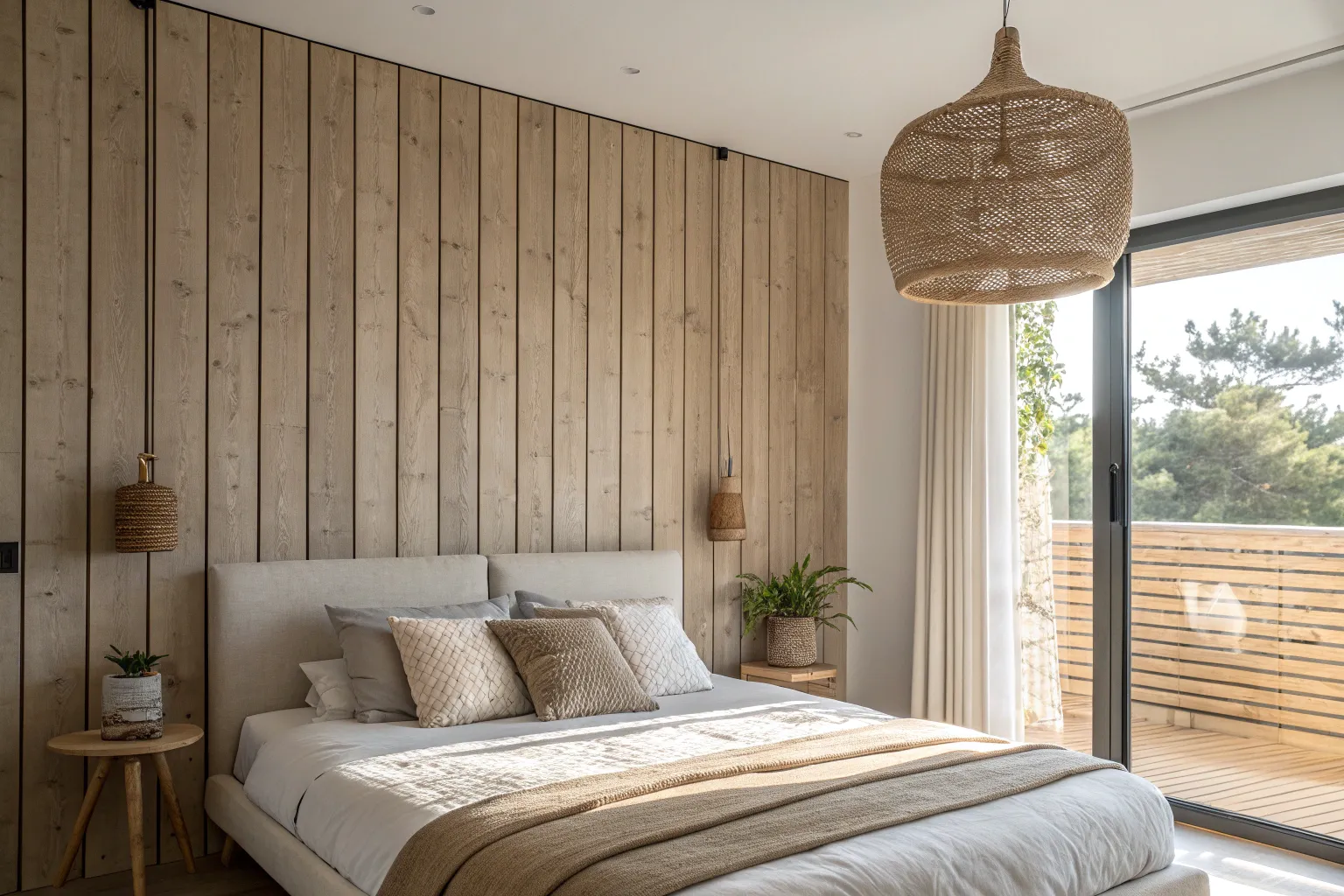 Letting natural wood grain shine behind the bed is one of those simple moves that always looks high-end. I’ve kept knots and character marks on purpose, and it makes the whole bedroom feel more grounded and real.