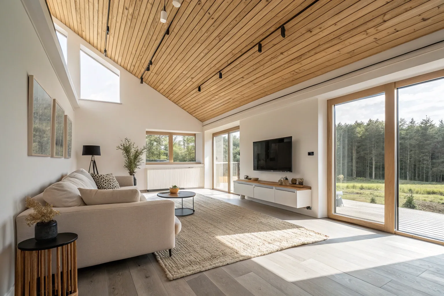 When I want maximum impact, I run wood slats across the entire ceiling so the room feels wrapped in texture from wall to wall. I’ve done this in a living room with light-toned boards, and it made the space feel calmer and more put-together overnight.