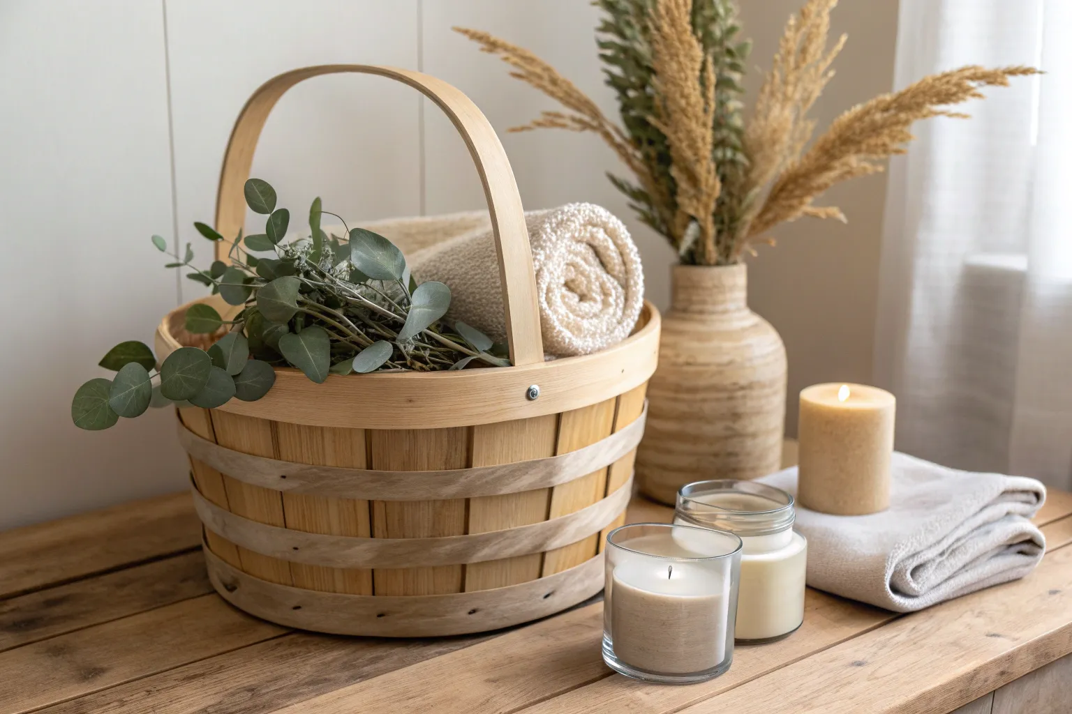 Stacking round wooden baskets with rolled towels is my favorite “spa-at-home” trick that also keeps linens accessible. I tried it in my own bathroom and loved how the warm wood tones made plain white towels look expensive.