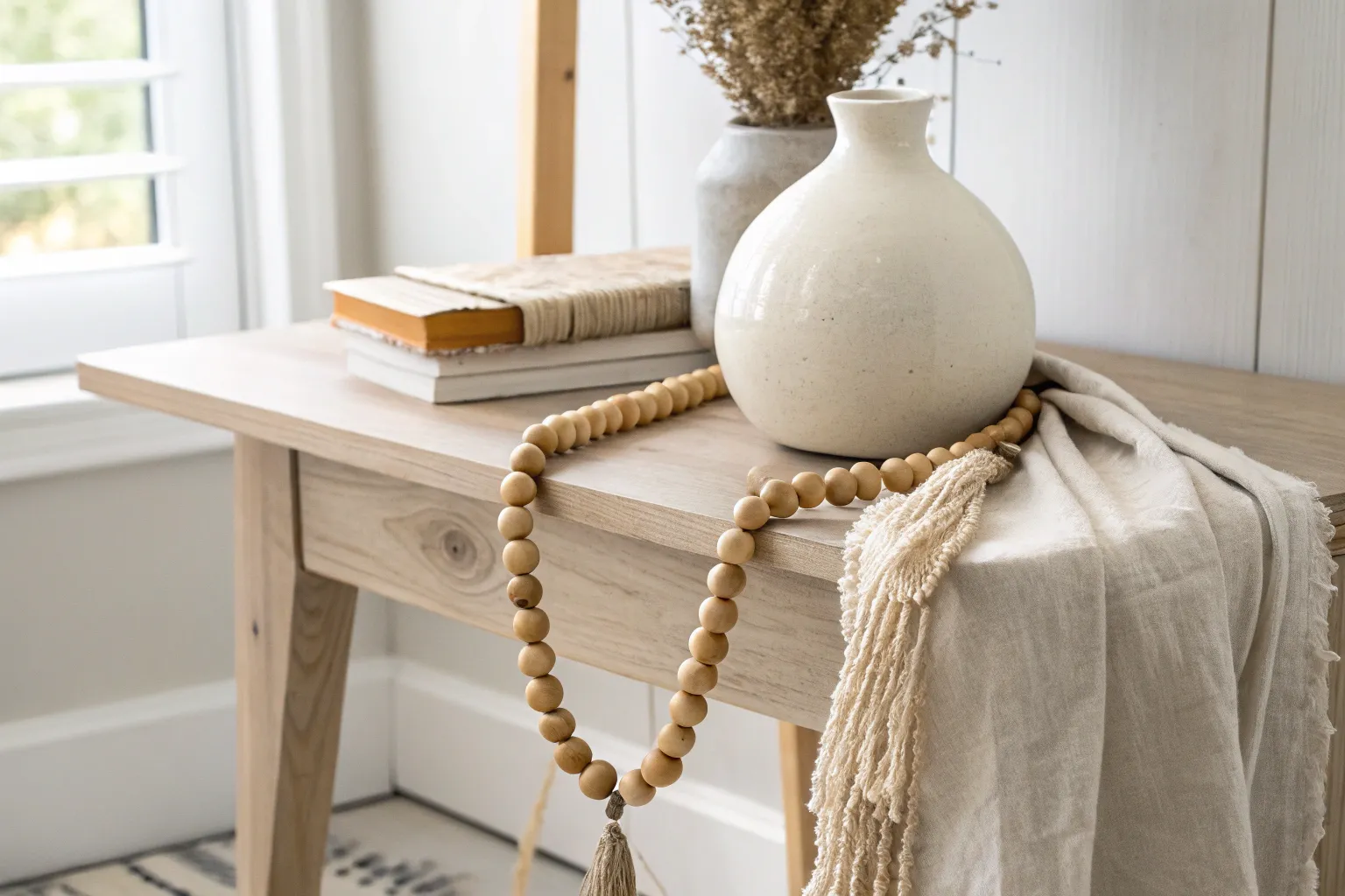 - Natural Wood Bead Garland with Tassels: Drape this rustic garland over stands or trays to instantly add texture and a cozy, farmhouse touch.