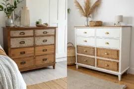 A simple shoe bench with a slatted lower shelf is my favorite small furniture build when you want big payoff without a huge time commitment. I’ve found that keeping the top thick-looking (even if it’s laminated) gives it that sturdy rustic feel.