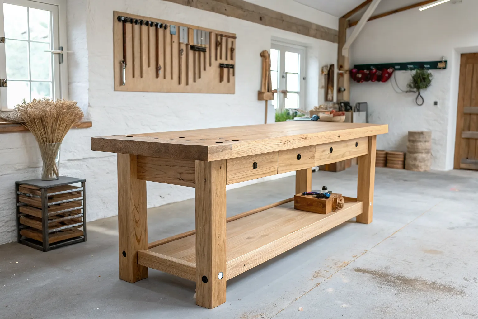 • Wooden Workbench with Storage Shelf: Create a central workspace with a sturdy table featuring lower storage to keep tools organized and accessible.